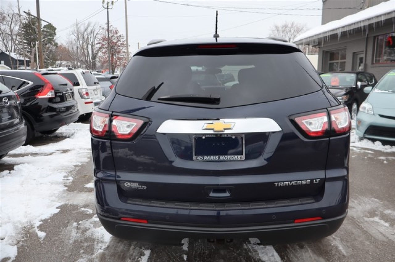 Contact Paris Motors Inc. today for information on dozens of vehicles like this 2015 Chevrolet Traverse LT. This Chevrolet Traverse LT defines excellence in an SUV. It has the convenience of limitless boundaries paired with city sophistication. More information about the 2015 Chevrolet Traverse: The Chevrolet Traverse starts at just about $31,000 and offers a lot of space and luxury for the price. Unlike other minivans available, the Traverse has bold SUV-like styling without giving up too much interior volume. The interior space combines with a cushy ride, to make the Traverse a fairly pleasant place to spend time in. The vehicle strikes a very nice balance between these various attributes, making it a good value for families seeking comfortable transportation. Strengths of this model include upscale amenities, attractive styling, Room for up to eight, car-like handling, and available all-wheel-drive For 60 years, our family-owned dealership has been treating customers honestly and with respect! Paris Motors is a past recipient of Michigan's Quality Dealer of the Year Award, selling preowned vehicles in the greater Grand Rapids area. View our entire inventory at www.parismotors.com or stop in & see us! Our hours of business are Monday-Thursday from 8am to 8pm, Friday from 8am to 6pm, and Saturday from 8am to 3pm- We look forward to serving YOU!! We accept VISA, Master Card, Discover, cash and personal check. Various options available for delivery - local and out of state. Call our TOLL FREE number for more INFORMATION or put a HOLD on the vehicle of your choice today with credit card deposit.