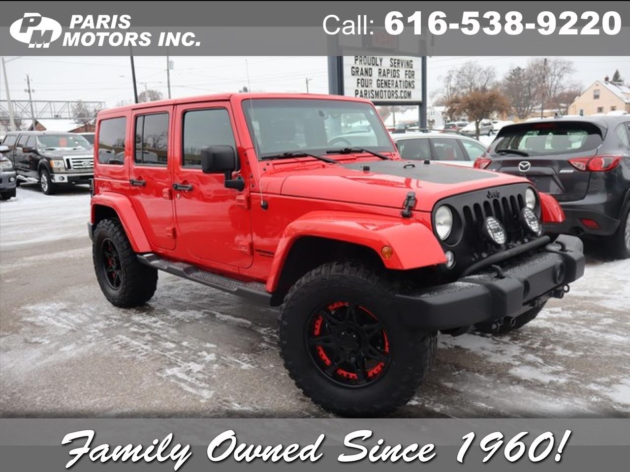 This 2014 Jeep Wrangler Unlimited Sahara is proudly offered by Paris Motors Inc. If you're in the market for an incredible SUV -- and value on-the-road comfort and manners more than ultimate off-road prowess or tow capacity -- you'll definitely want to check out this Jeep Wrangler Unlimited Sahara. This 4WD-equipped vehicle will handle majestically on any terrain and in any weather condition your may find yourself in. The benefits of driving an Four Wheel Drive vehicle, such as this JeepWrangler Unlimited Sahara, include superior acceleration, improved steering, and increased traction and stability. The Wrangler Unlimited Sahara has been lightly driven and there is little to no wear and tear on this vehicle. The care taken on this pre-owned vehicle is reflective of the 105,787mi put on this Jeep. More information about the 2014 Jeep Wrangler Unlimited: With prices starting at a little over $22,000 with standard 4-wheel drive, the classic Wrangler is one of the best SUV values available. The 6-speed manual transmission helps the Wrangler achieve a decent 17 mpg city and 21 mpg highway rating. Jeep considers the Wrangler's off-road prowess integral to the brand and they continue to make one of the most capable 4-wheel drive vehicles available. Strengths of this model include 2- and 4-door configurations available, impressive off-road prowess, and Iconic styling For 60 years, our family-owned dealership has been treating customers honestly and with respect! Paris Motors is a past recipient of Michigan's Quality Dealer of the Year Award, selling preowned vehicles in the greater Grand Rapids area. View our entire inventory at www.parismotors.com or stop in & see us! Our hours of business are Monday-Thursday from 8am to 8pm, Friday from 8am to 6pm, and Saturday from 8am to 3pm- We look forward to serving YOU!! We accept VISA, Master Card, Discover, cash and personal check. Various options available for delivery - local and out of state. Call our TOLL FREE number for more INFORMATION or put a HOLD on the vehicle of your choice today with credit card deposit.