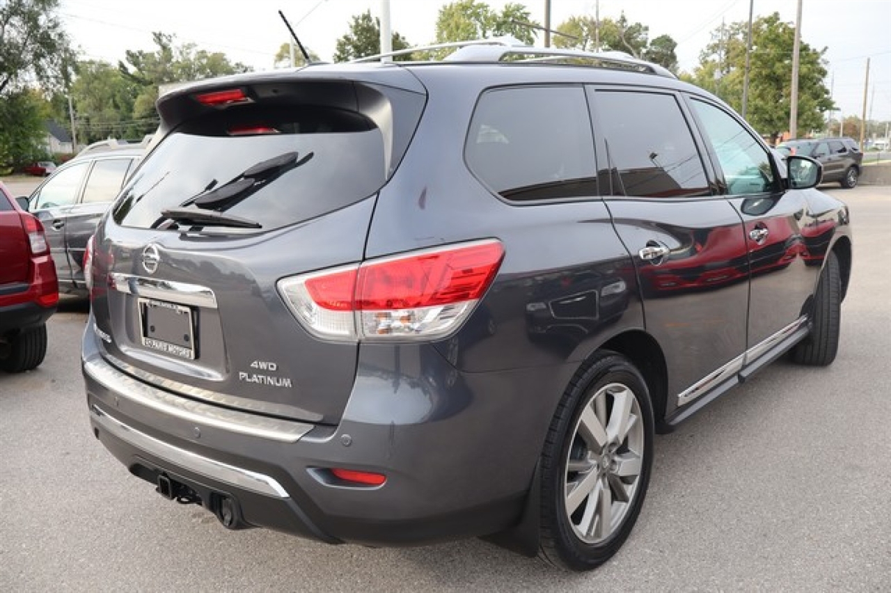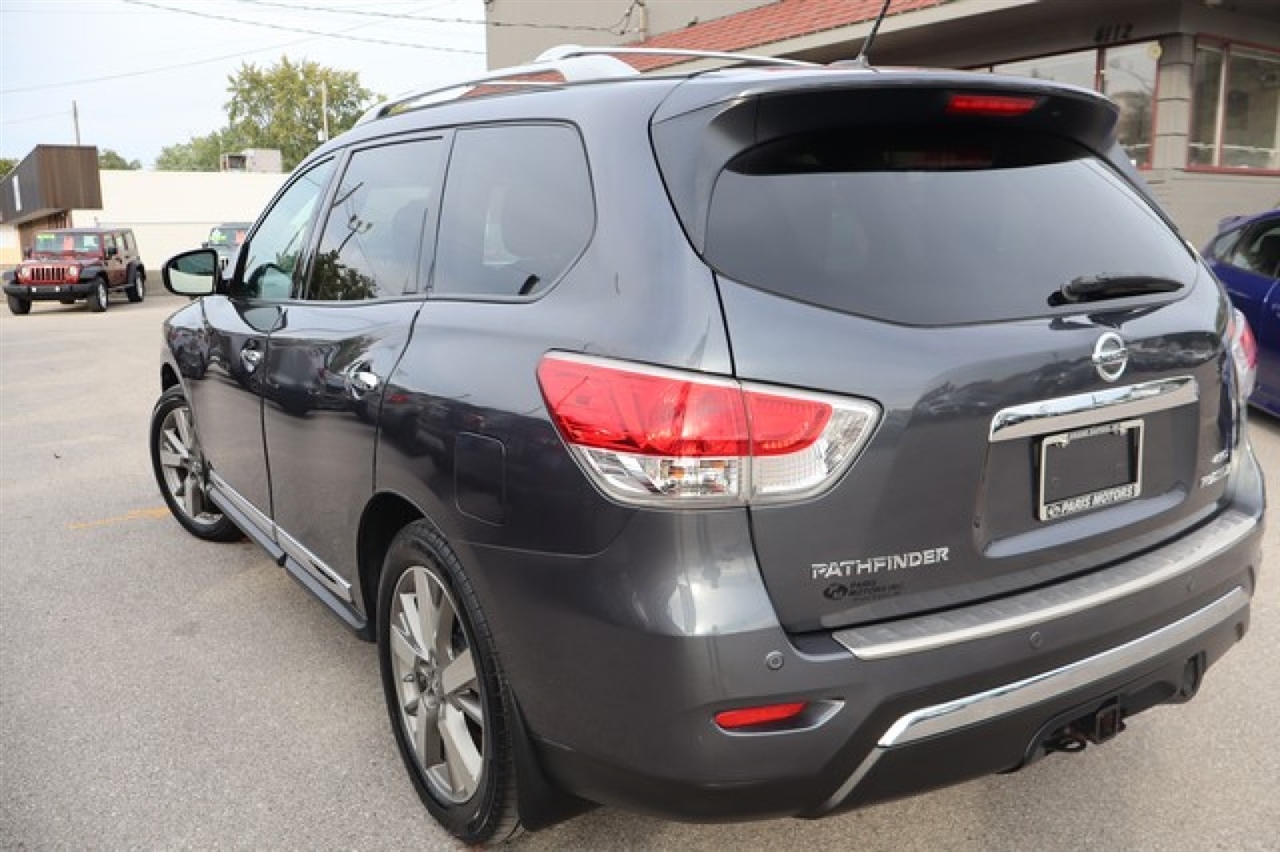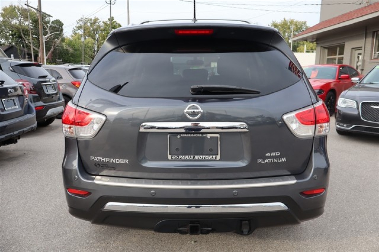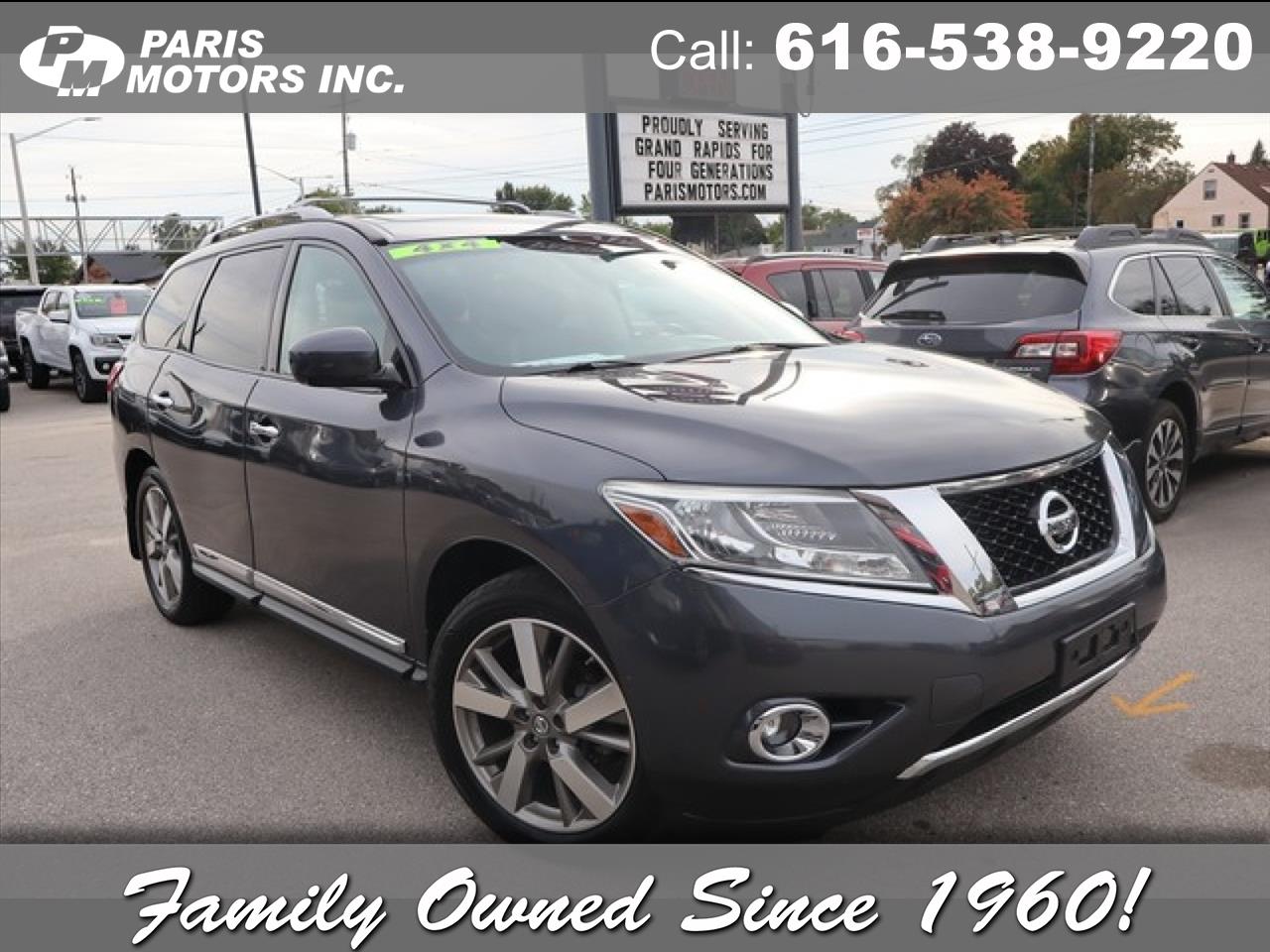 Contact Paris Motors Inc. today for information on dozens of vehicles like this 2014 Nissan Pathfinder Platinum. Treat yourself to an SUV that surrounds you with all the comfort and conveniences of a luxury sedan. The Nissan Pathfinder Platinum's pristine good looks were combined with the Nissan high standard of excellence in order to make this a unique find. When Nissan created this vehicle with 4 wheel drive, they immediately enhanced the performance ability. Easily switch between two and four wheel drive to take advantage of the improved traction. Low, low mileage coupled with an exacting maintenance program make this vehicle a rare find. More information about the 2014 Nissan Pathfinder: The Pathfinder remains a very good value for the money. Between its seating capacity and fuel economy the Pathfinder makes a good value play. While previous Pathfinders competed with truck-like SUVs like the Toyota 4Runner, the 2014 Pathfinder aims instead to compete more closely with crossover vehicles such as the Toyota Highlander, bringing more space and refinement to the market at a slight cost to seldom used off-road capabilities. The new-for-2014 hybrid makes 26 combined mpg, impressive fuel economy for any SUV, particularly one that can haul up to 7 passengers. Strengths of this model include competitive pricing, third row seating, 5000lb towing capacity, available hybrid drivetrain, Good fuel economy, and spacious interior For 60 years, our family-owned dealership has been treating customers honestly and with respect! Paris Motors is a past recipient of Michigan's Quality Dealer of the Year Award, selling preowned vehicles in the greater Grand Rapids area. View our entire inventory at www.parismotors.com or stop in & see us! Our hours of business are Monday-Thursday from 8am to 8pm, Friday from 8am to 6pm, and Saturday from 8am to 3pm- We look forward to serving YOU!! We accept VISA, Master Card, Discover, cash and personal check. Various options available for delivery - local and out of state. Call our TOLL FREE number for more INFORMATION or put a HOLD on the vehicle of your choice today with credit card deposit.